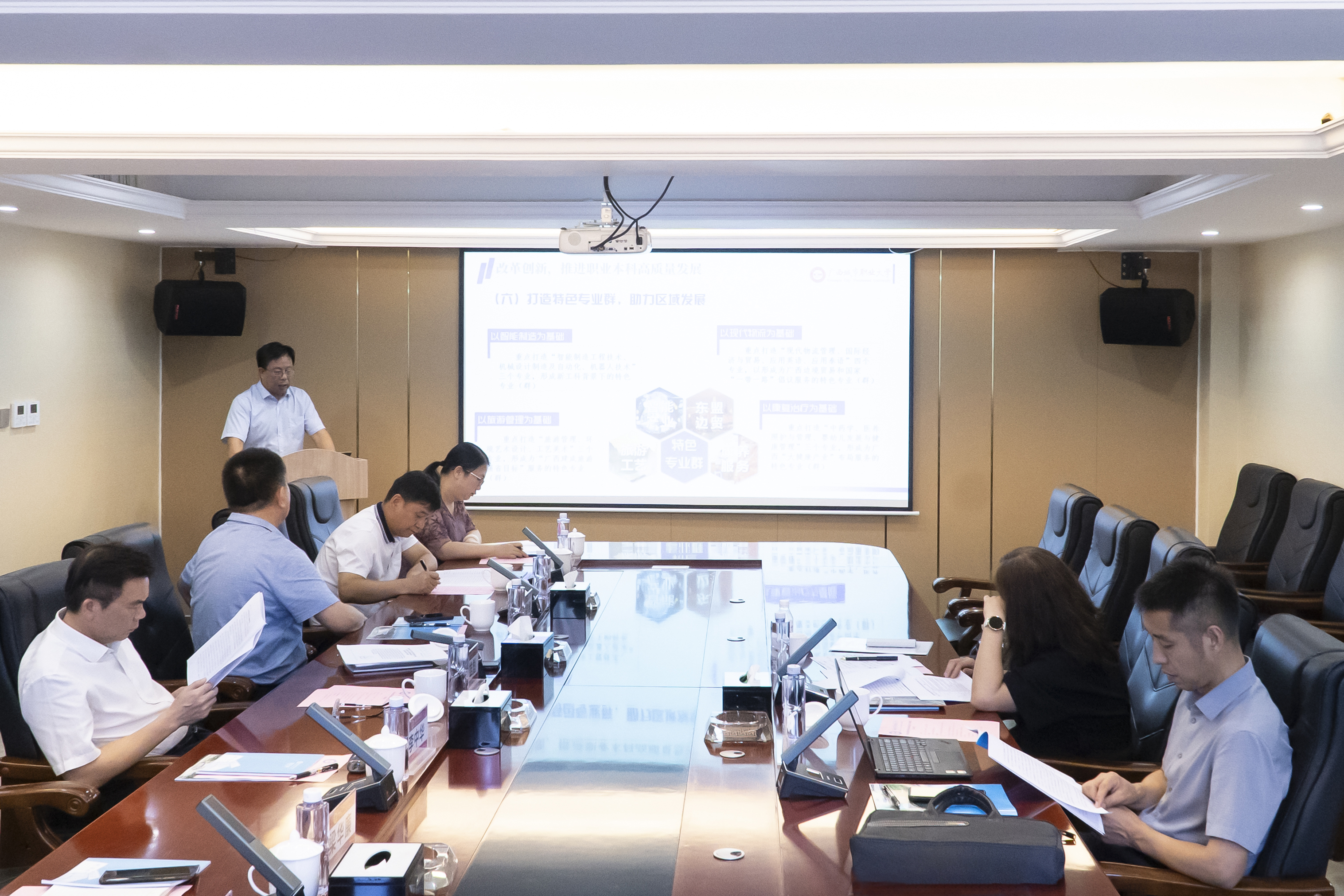 10月25日,教育部教育质量评估中心主任范唯,教育部教育质量评估中心评估处副处长李军等一行到我校调研指导职业本科教育教学工作并召开调研会,自治区教育厅党组副书记、副厅长、一级巡视员黄雄彪,自治区教育厅职业教育与成人教育处处长覃壮才,广西教育研究院职业教育研究所所长李春鹏,学校董事长宁德君,校长李中华等陪同调研并参加座谈会。