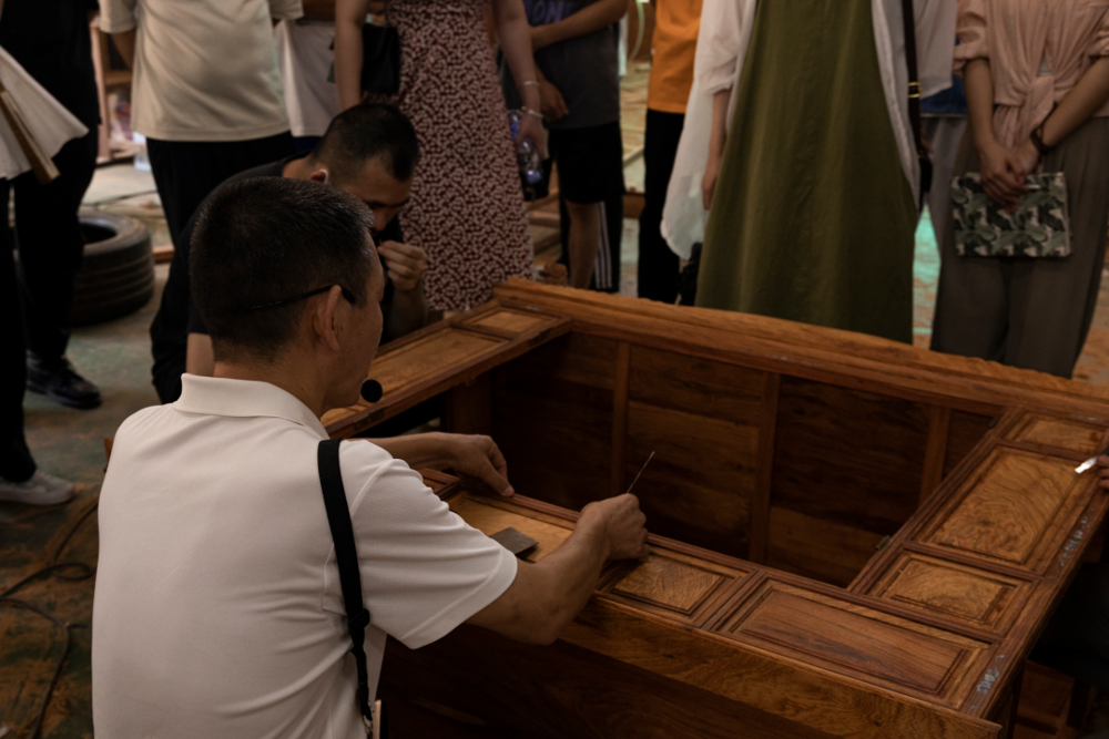 2022年8月9日下午4点,艺术设计与文化传媒学院邀请张伟强老师在家具实训基地开展红木文化宣讲,师生们认真听讲。
