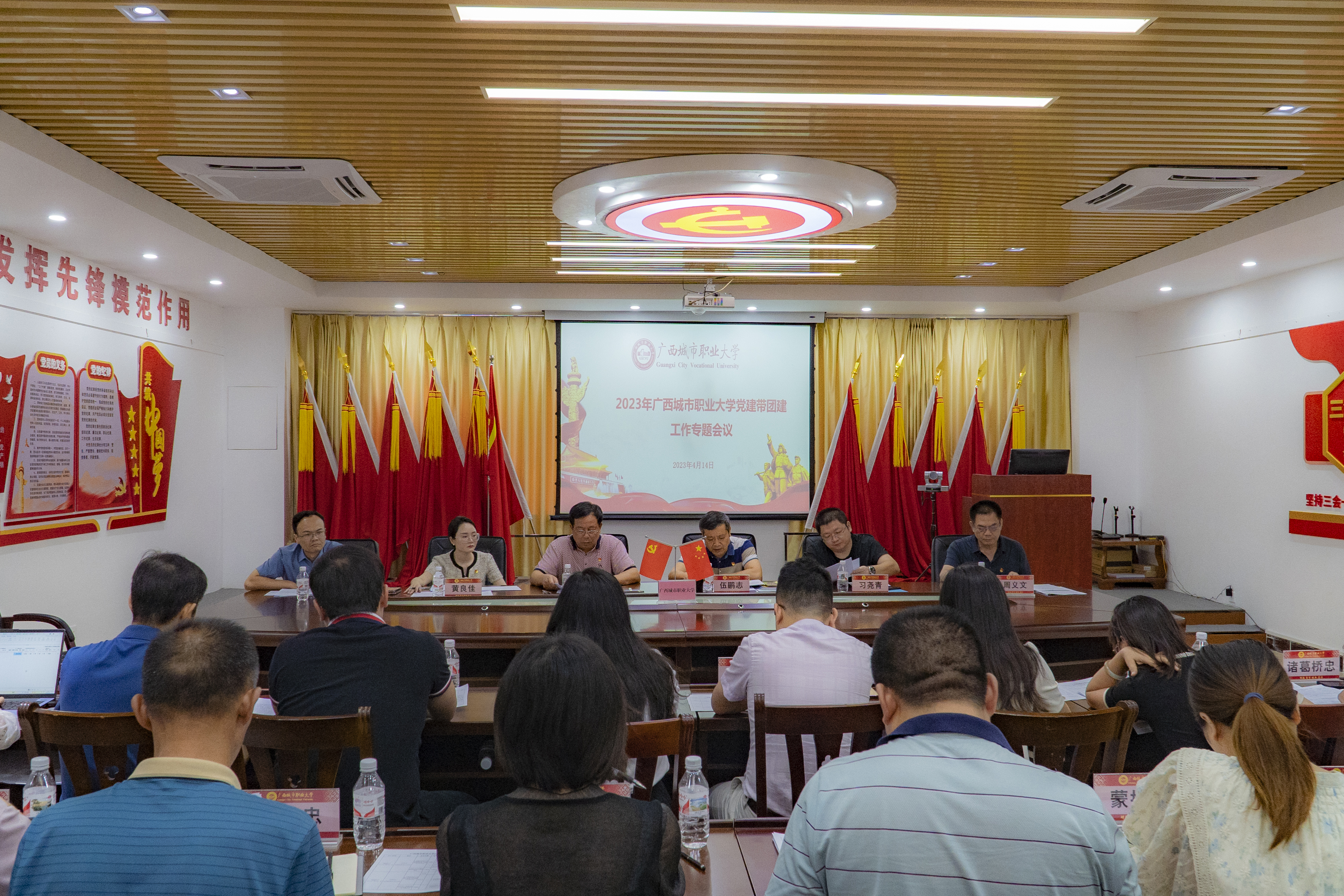 为了进一步彰显党建带团建的政治性、先进性、群众性,充分发挥团组织的桥梁和纽带作用,4月14号下午,我校在尚美楼三楼党员活动室召开党建带团建工作会议。党委书记伍鹏志出席并主持会议,各学院党总支书记、各职能部门负责人参加会议。