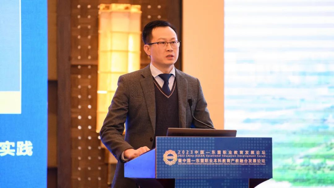 唐臣教授在中国—东盟职业本科教育产教融合发展论坛上以《四引四融 跃层引领——职业本科教育专业及专业群高质量发展实践》为题作主旨演讲