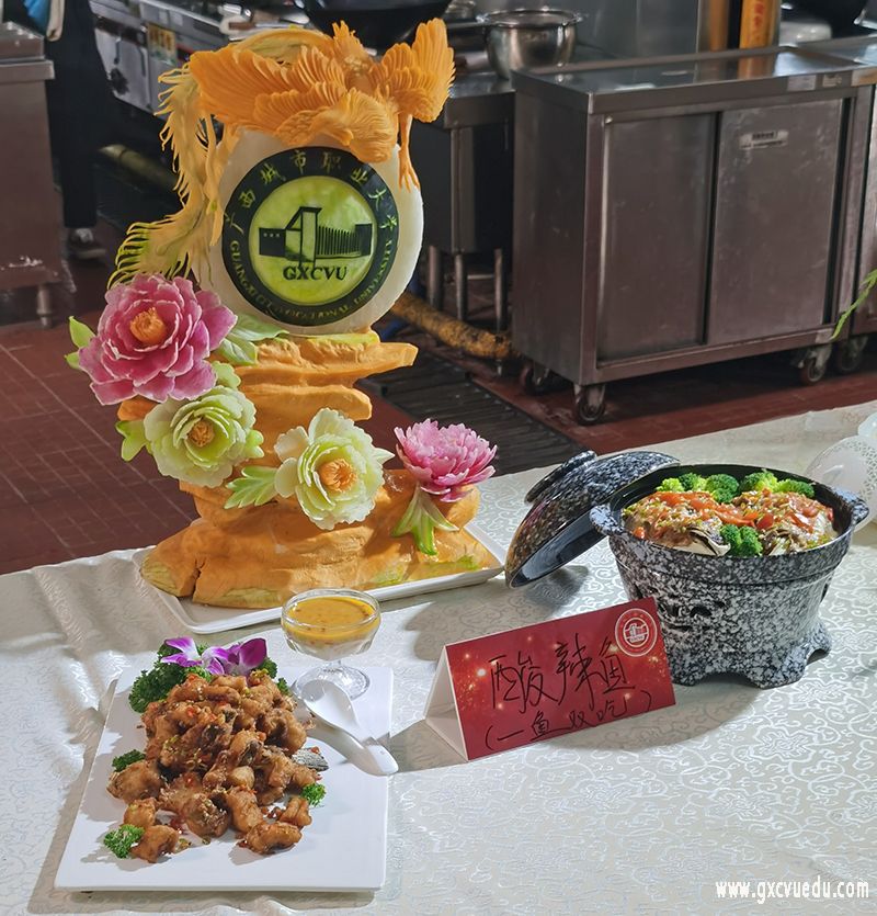 我校团队抽到了大头鱼主食材,师生们快速构思后,决定做成一鱼两吃的酸辣鱼菜品,配以扶绥酸粥为蘸料,味道咸酸辣爽,赢得多位评委的好评。比赛最终成绩将在第二轮录制现场揭晓。